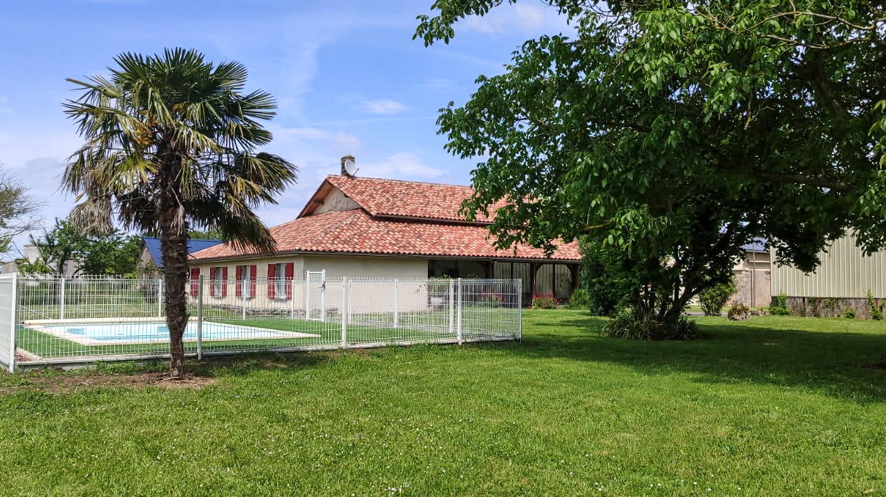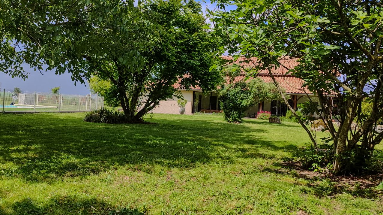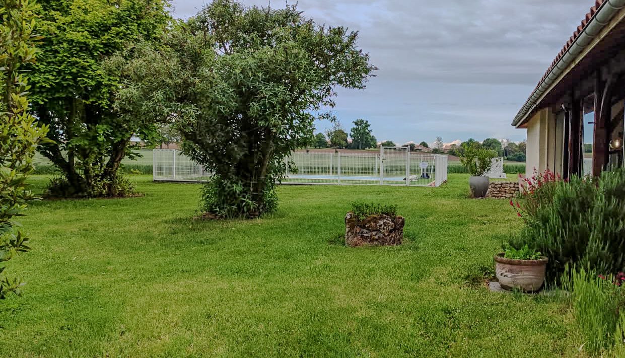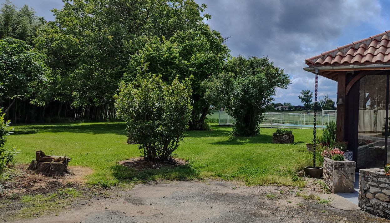 Terrain arboré, avec table de ping-pong, balançoires, anneaux, barbecue, table et chaises de jardin, parking