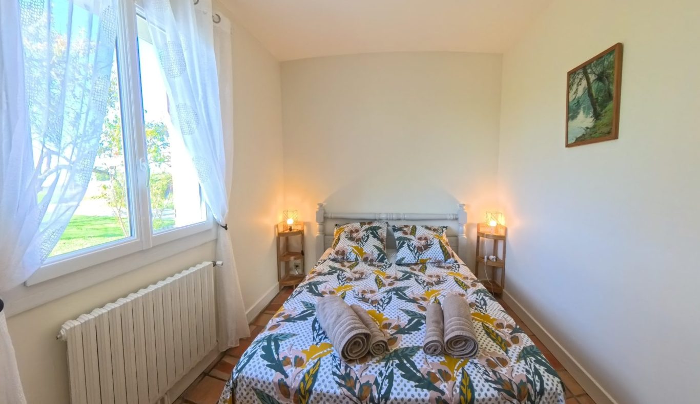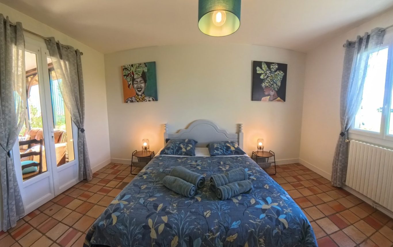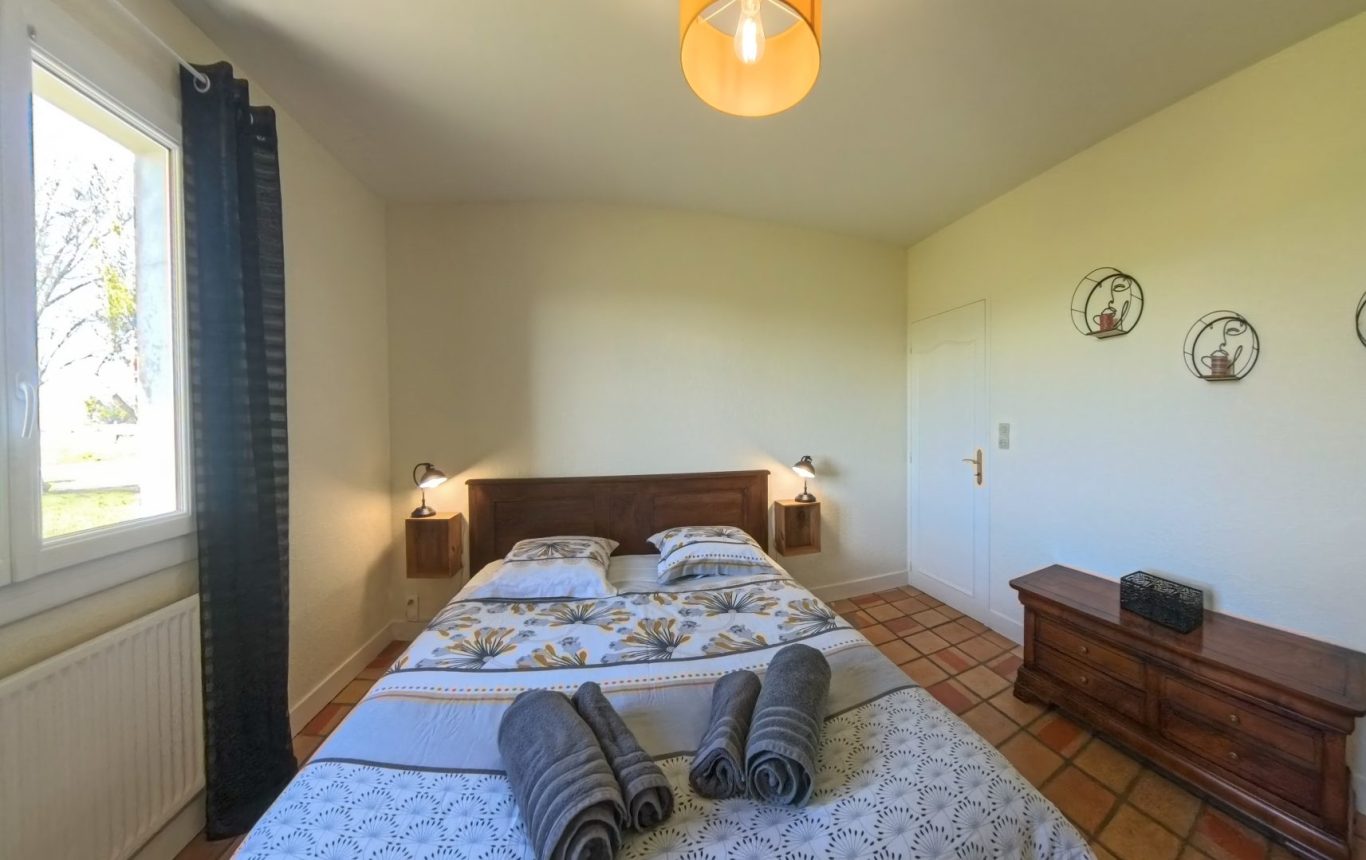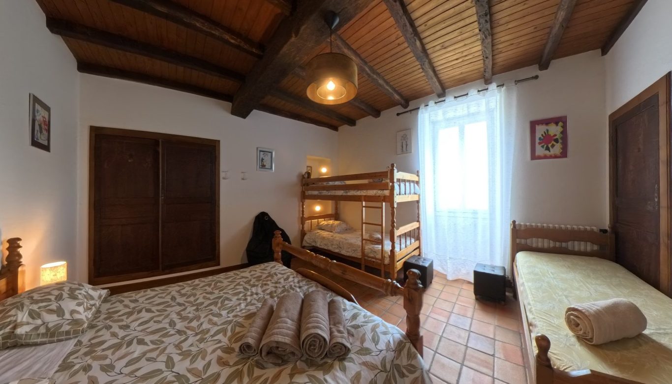1 chambre avec un lit double (150 cm) 1 lit (90cm) et deux lits superposés (90 cm)