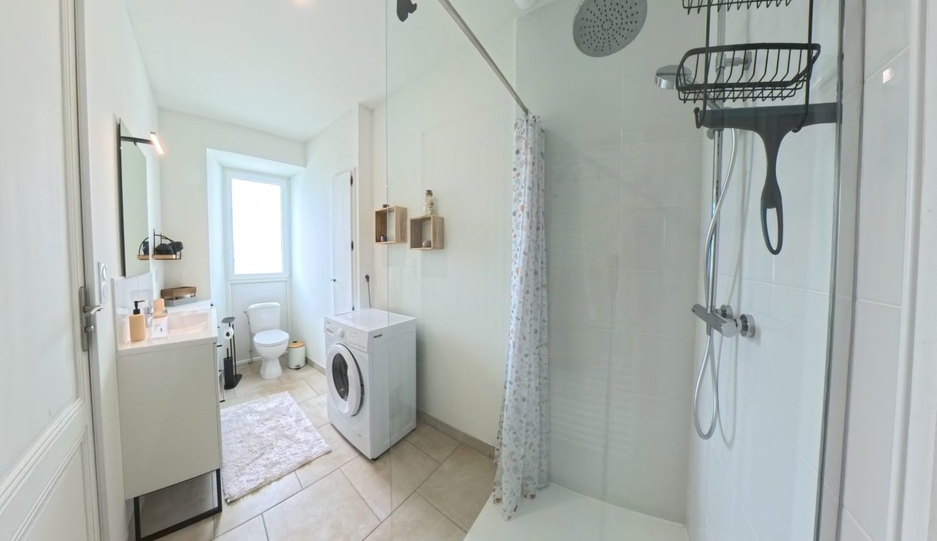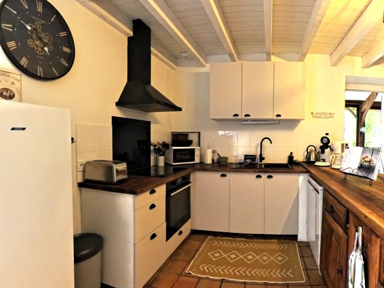 Cuisine entièrement équipée, 1 cafetière Senseo,1 Cafetière à filtre,bouilloire, micro-onde, plaque à induction 3 feux, four, lave vaisselle 12 couverts, réfrigérateur et congélateur séparé, grille pain.